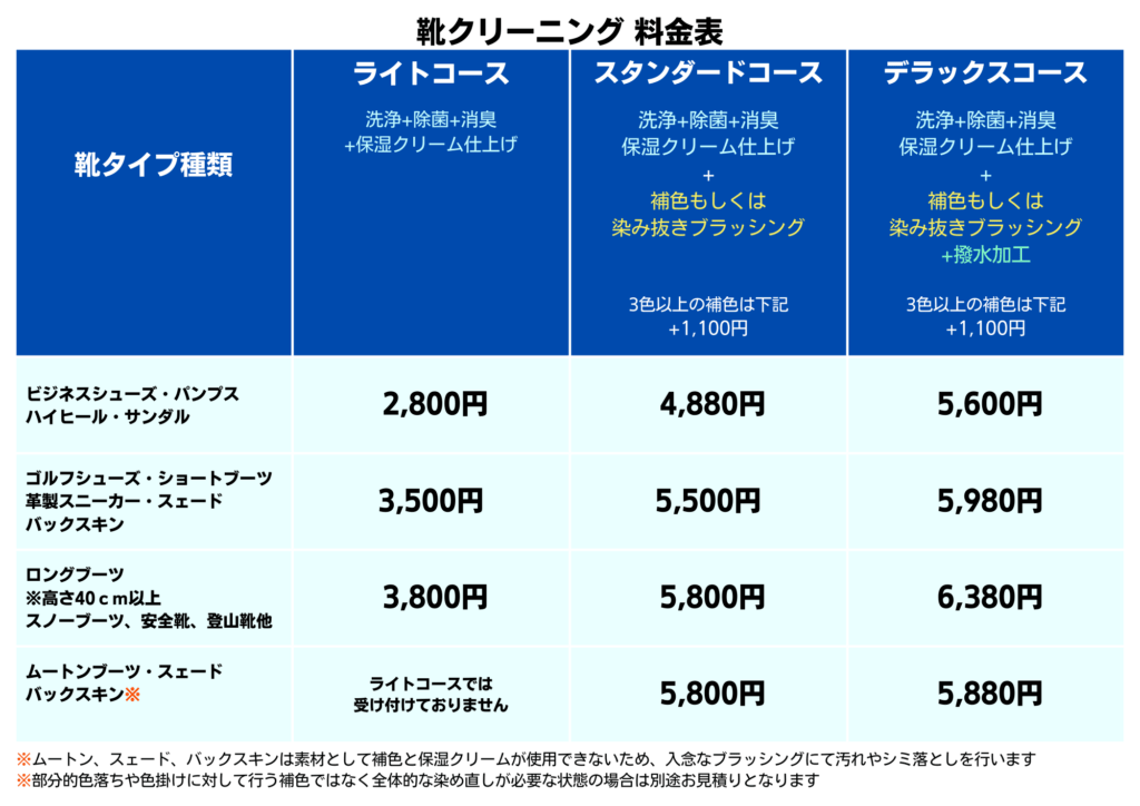 ※起毛タイプ(スェード、ムートン、バックスキン)は補色及び保湿クリーム仕上げができない素材のため、入念なブラッシングを行います - タイプ別靴クリーニング基本料金表→